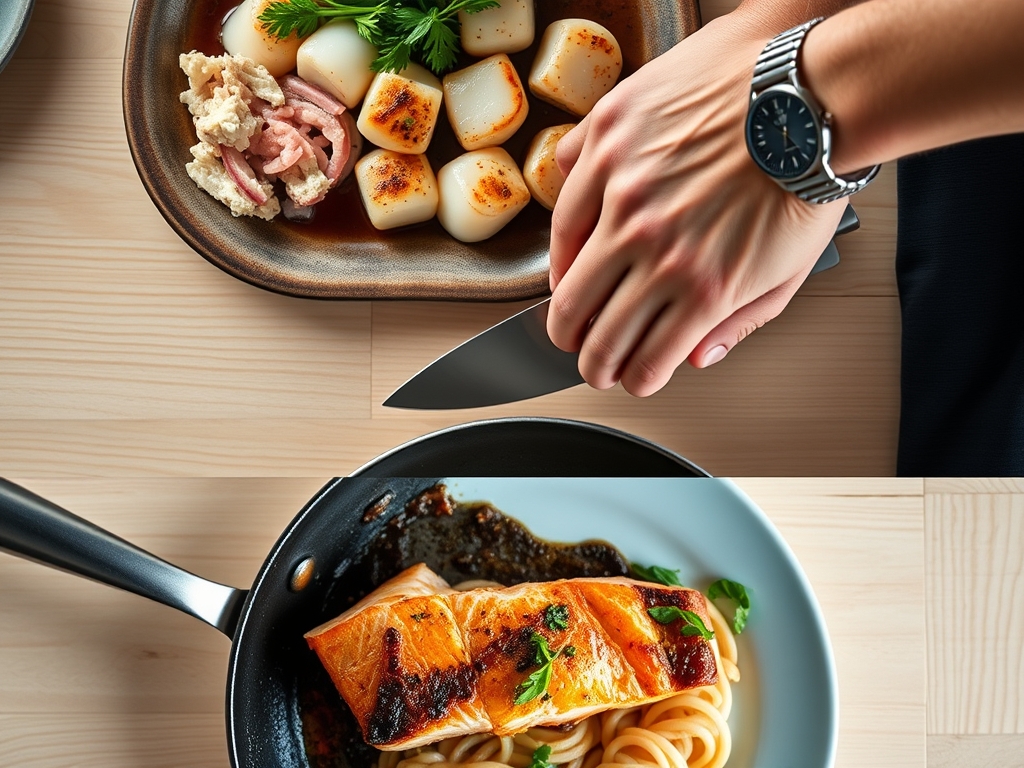 The flow begins with the salmon, as it requires a slightly longer duration to render the subcutaneous fat and reach an internal temperature of 125 degrees Fahrenheit. While the salmon rests, the scallops take center stage. They require only 90 seconds per side. By the time the scallops are finished, the salmon has redistributed its juices, ensuring a moist bite. Use a digital scale to portion your proteins evenly, which guarantees a synchronized cook time across the pan.